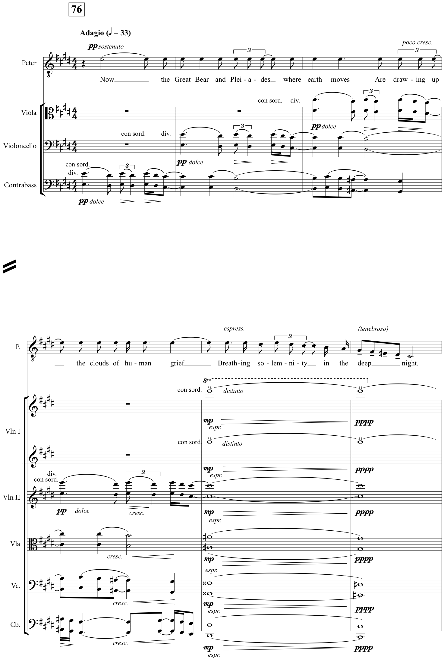 from the Borough (which, immediately before, has been concerned with the E♭-minor storm), making him ‘other’ even more powerfully than his metrically disruptive D-rooted responses to the legalistic, foursquare B♭ of the Prologue (for instance, at 1:6). The tonally ‘pure’ string orchestration (another memory of his famous ‘haloed’ utterances in court), with its steadily increasing registral and dynamic range, further sets this moment apart from its surroundings. It is meant to sound as alien in its context as the Borough feels he is in theirs.