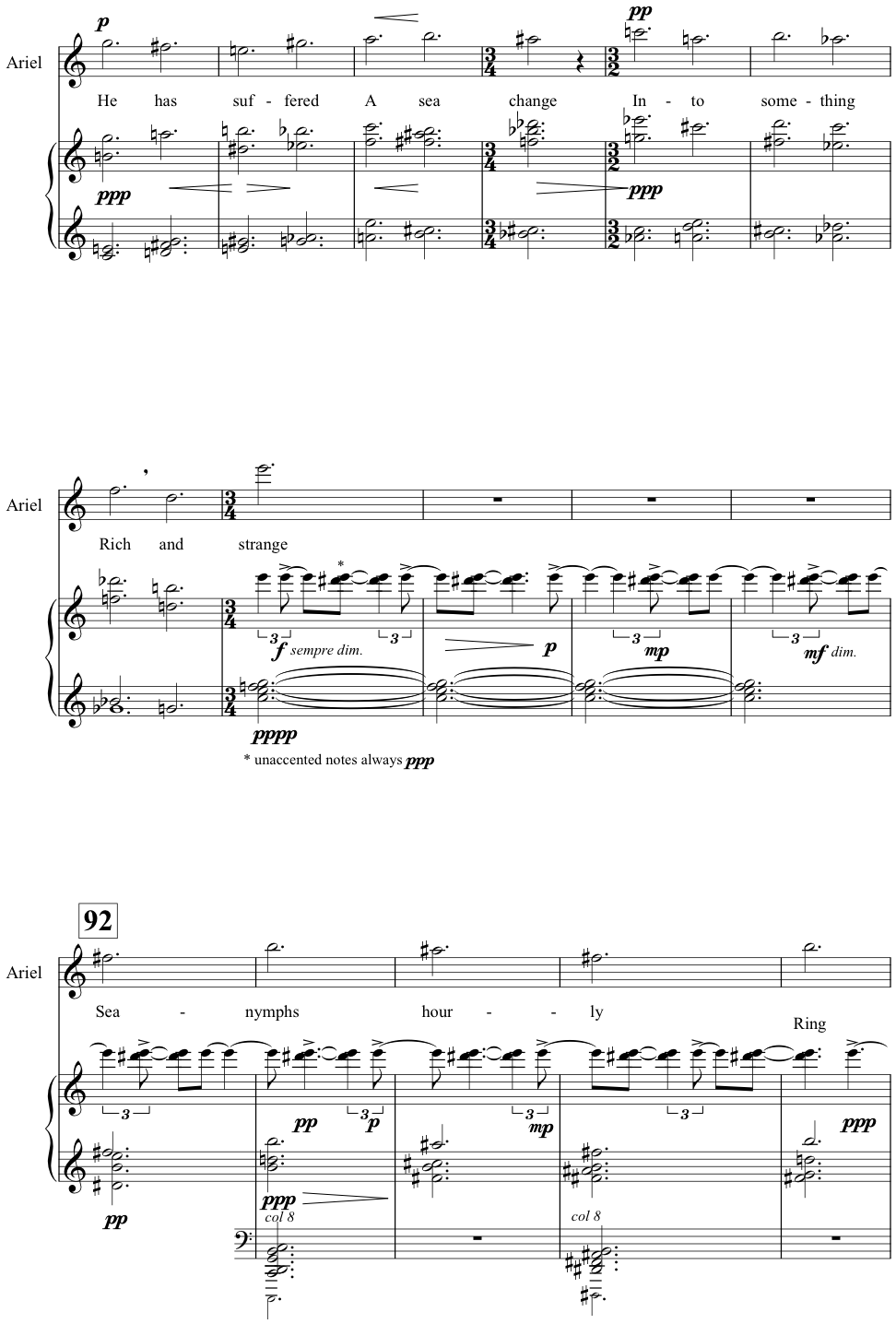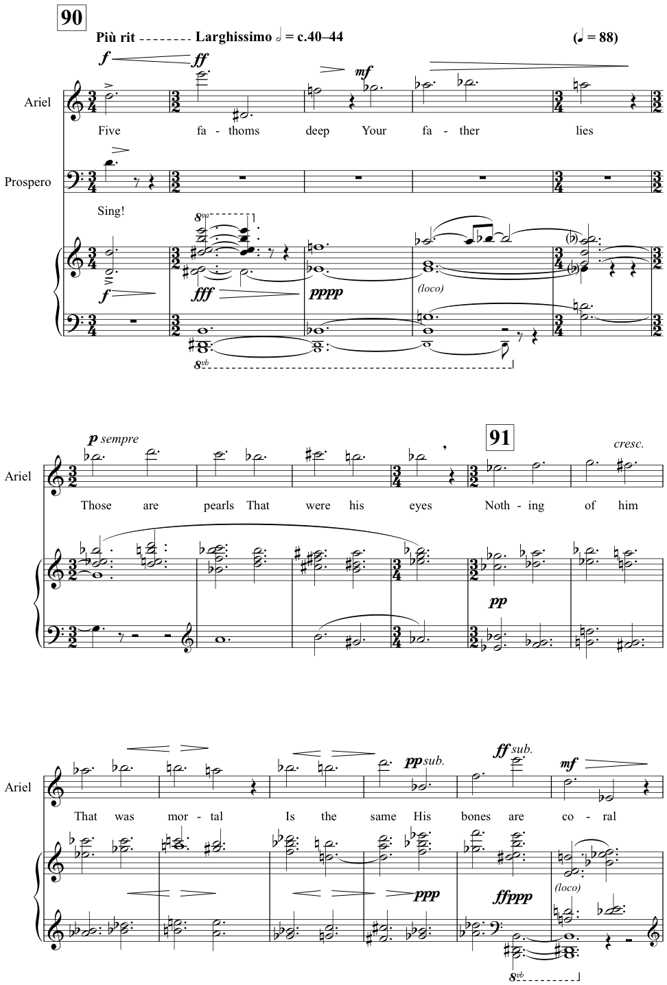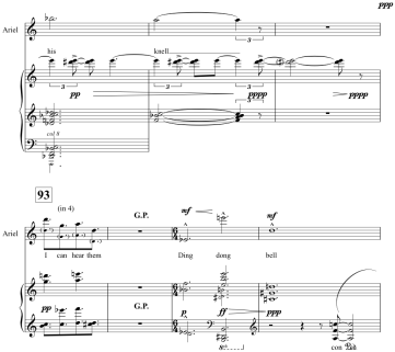 A less morally ambiguous presentation of an operatic other that owes much to Britten’s choice of tone and symbolism in this aria, and which illuminates the present case, is that of Thomas Adès’s Ariel in his opera The Tempest (2003–4). That sexless creature of the spirit realm is kept distinct from the human characters in the opera through the use of a consistently and exceptionally high tessitura that begins with a leap e2–e3 (Act 1, 44:1) and becomes immediately associated with that stratospheric note throughout the opera, surmounting it only by rising to a ppp f3 in the closing bars (Act 3, 333:11).[27] Ariel’s desire throughout the opera, as in Shakespeare’s play, is for release from bondage, and nowhere is Ariel’s separation from Prospero’s world of indiscriminate retribution felt more poignantly than in the Act 1 aria, ‘Five fathoms deep’ (90:1–93:4; see Ex. 4). Here, as in the ‘Great Bear’ soliloquy of Peter Grimes, the operatic action ceases; the storm of Prospero’s wrath (the tempest of the play) opens up into this glimmeringly beautiful moment of stasis, and because it is Ariel singing, we are suspended in the higher, unearthly spheres that are the object of Grimes’s gaze. Adès’s tonal palette is richer here than Britten’s, and the coincidence that both Peter and Ariel hover around an E (Peter infinitely more obsessively – it is his very identity that is at stake, in a way that it is not for Ariel) cannot be meaningful. But in both cases, we are starkly confronted with alienation, and a presentation of the alienated individual so sympathetic that we cannot fail to take sides.