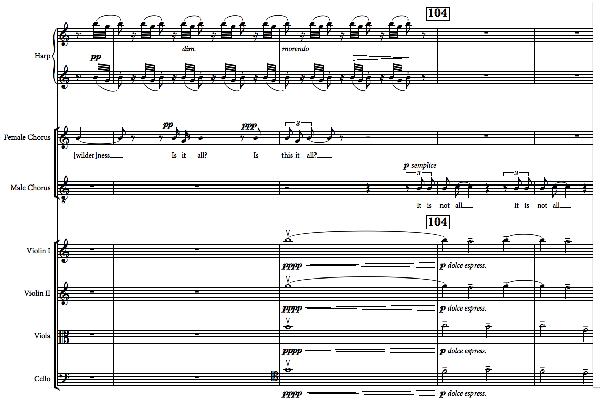 During this final presentation of E major for the mourning ensemble from Fig. 95 there is the most powerful sequence of tonal events. First, as the ensemble asks ‘how is it possible that she being so pure should die?’, the E major harmony underpins the act’s second strong ^3 – ^2 – ^1 linear progression in C major. If C major, bound up with her chastity, directly focuses the ‘staining’ nature of the B, then E major, which follows as tonic in response to B’s dominant, allows the epilogue to stand back from the issues that have driven the opera so far. Having opened up a separate tonal space between figures 95 and 104 through a reinterpretation of this B, the opera’s Christian viewpoint can now potentially find intellectual space as an ‘objective’ reflection on the meaning of Lucretia’s tragedy, occasioned by her ‘staining’ B. So the music returns, as the Male Chorus sings ‘It is not all’ with the most poignant resolution of the melodic B to C in the entire opera (see Example 5), to the question of what Lucretia’s suffering indicates, now with a Christian gloss. Yet structurally this is ‘not all’, because B lingers in the harmony and it is only in the closing bar that the ‘stain’ of Lucretia’s ‘leading-on note’ is finally resolved upwards to C. The Christian redemption seems to come at last, and Lucretia’s shame is washed away by the Christian God. This final gesture has disappointed critics who do not share Britten’s faith (if even he had it), but in closing I should like to offer two opposing interpretations of this conclusion.